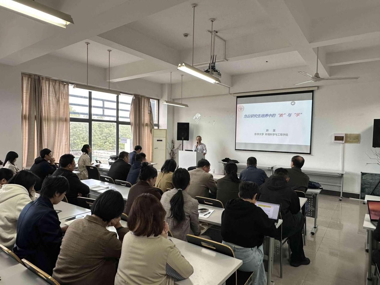 11月11日,太阳成tyc122cc于实训楼4418开展研究生导师培训,东华大学博导、水污染控制学科带头人薛刚教授围绕“刍议公司产品中的‘教’与‘学’”主题和学院82名导师共探育人路径。
