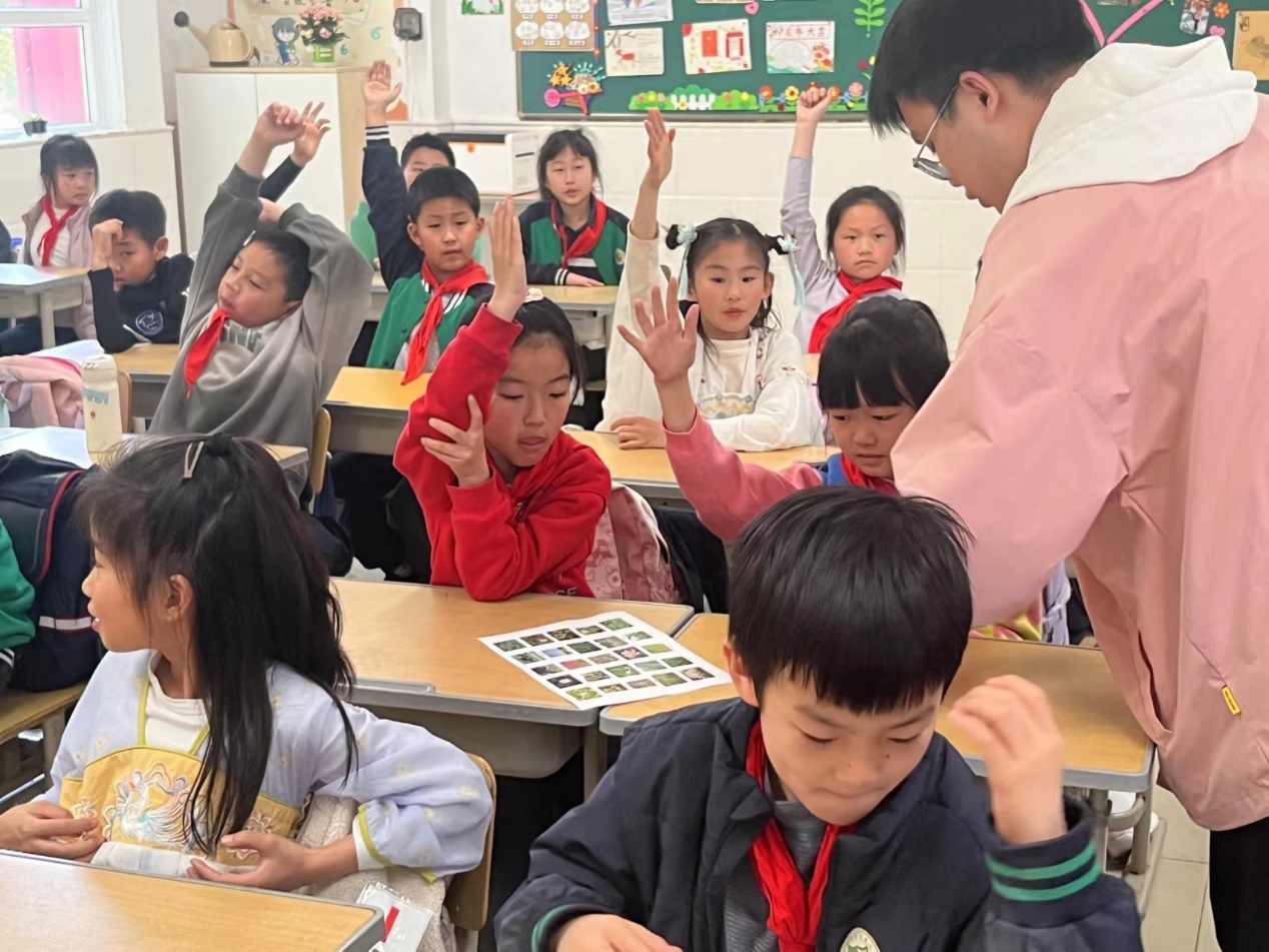 Gu Dungang, a Party member teacher specializing in environmental engineering, gave a lecture titled What is Green Power? He vividly explained abstract concepts such as carbon neutrality and biological carbon sequestration to children, explaining what Green Power is, the relationship between carbon neutrality and Green Power, and how to strengthen Green Power. After the lecture, undergraduate students majoring in environmental engineering, Cheng Zifan and Pan Jiaqi, presided over the game segment after the activity. They led the children to memorize some common plants and birds in Shanghai by looking at pictures, and encouraged them to remember as many species names as possible within a specified time through a challenge competition. The children were enthusiastic and eager to answer questions, gradually increasing their understanding of the diversity of flora and fauna in this city.